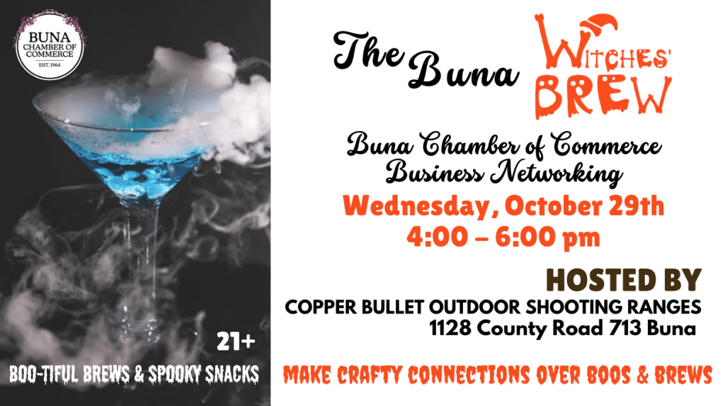 Join the Buna Chamber of Commerce for a spooktacular twist on our monthly networking event β€” The Buna Brew!This October, we’re stirring the pot with a little Halloween spirit (and spirits 🍹) for an evening of fun, connection, and community.