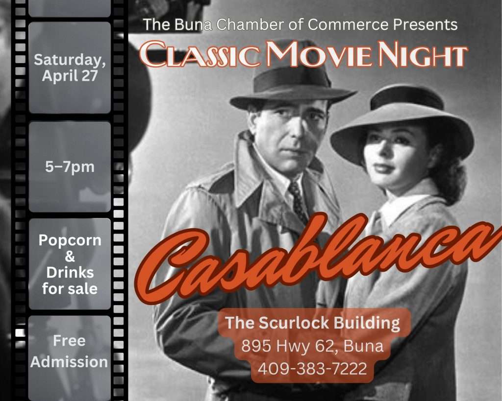 Join us at the historic Scurlock Building on Main Street for our new Classic Movie Night Series, presented by the Buna Chamber of Commerce.