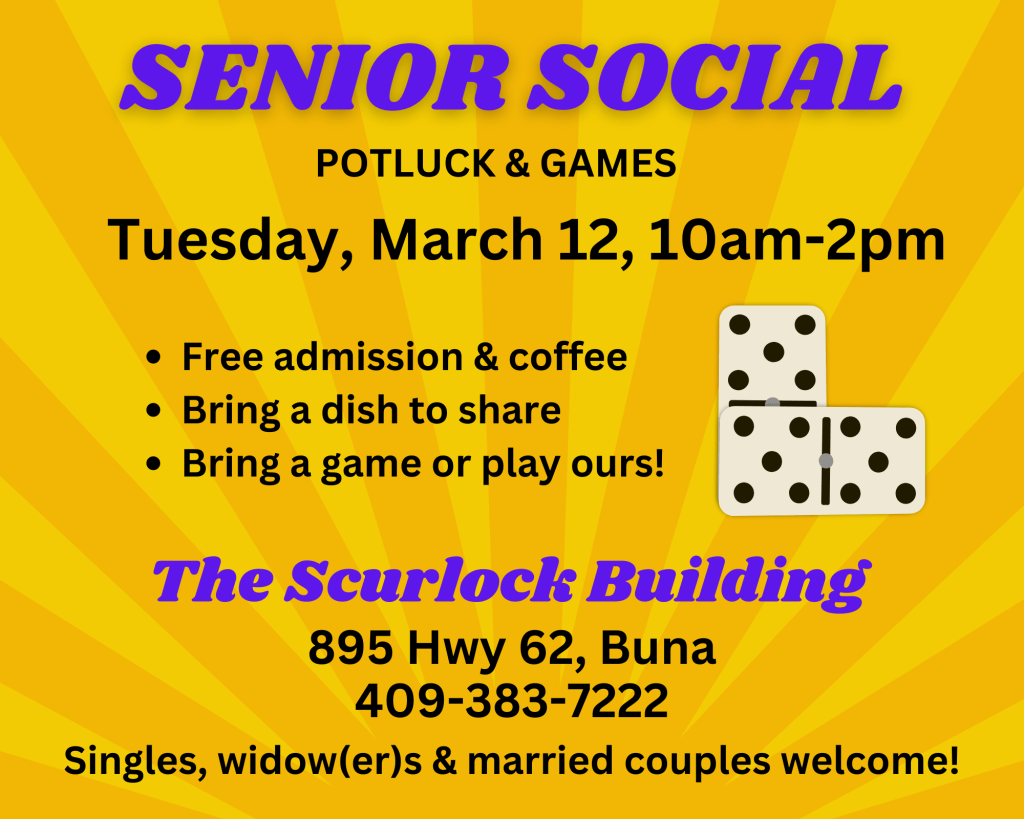 Join us Tuesday, March 12, 10am-2pm for a free senior social. Bring a dish to share and play dominoes, cards, etc. 55+ welcome!