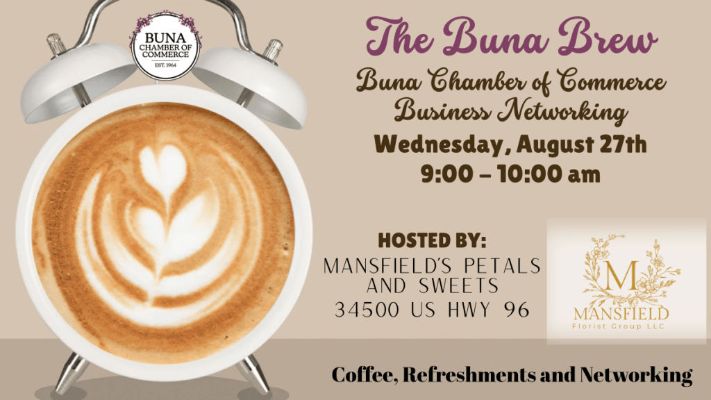 Join the Buna Chamber of Commerce for the August Buna Brew, our monthly networking event designed to bring local business owners, entrepreneurs, and community leaders together in a relaxed, welcoming setting.
