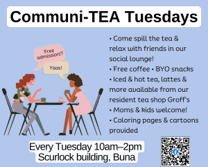 Every Tuesday starting April 16, the Buna and surrounding community is welcome to come “spill the tea” and relax with friends in our social lounge inside and on the porch the historic Scurlock Building.